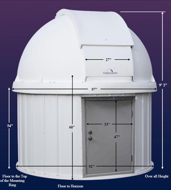 In March of 2012, a Model RBBLD-8 "Deluxe ExploraDome White Dome w/Black Lining with 8' Round Building" was delivered to the SOCO location. Dimensions of this model are shown in Figure 2. The plastic dome was delivered as one piece. The sheet metal panels for the walls, the PVC base ring, and the plastic upper ring on which the dome rotates comprised the un-assembled lower portion of the structure.