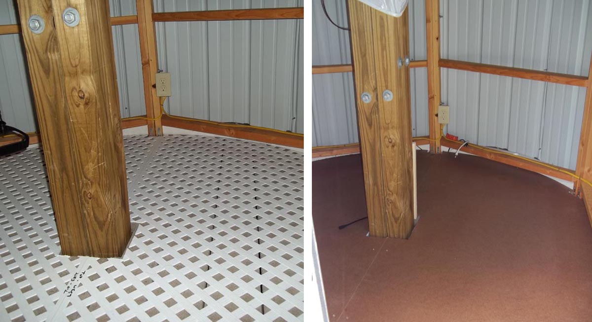| Figure 9. The plastic lattice sub-floor (left) and fiberboard floor (right) inside the observatory. |