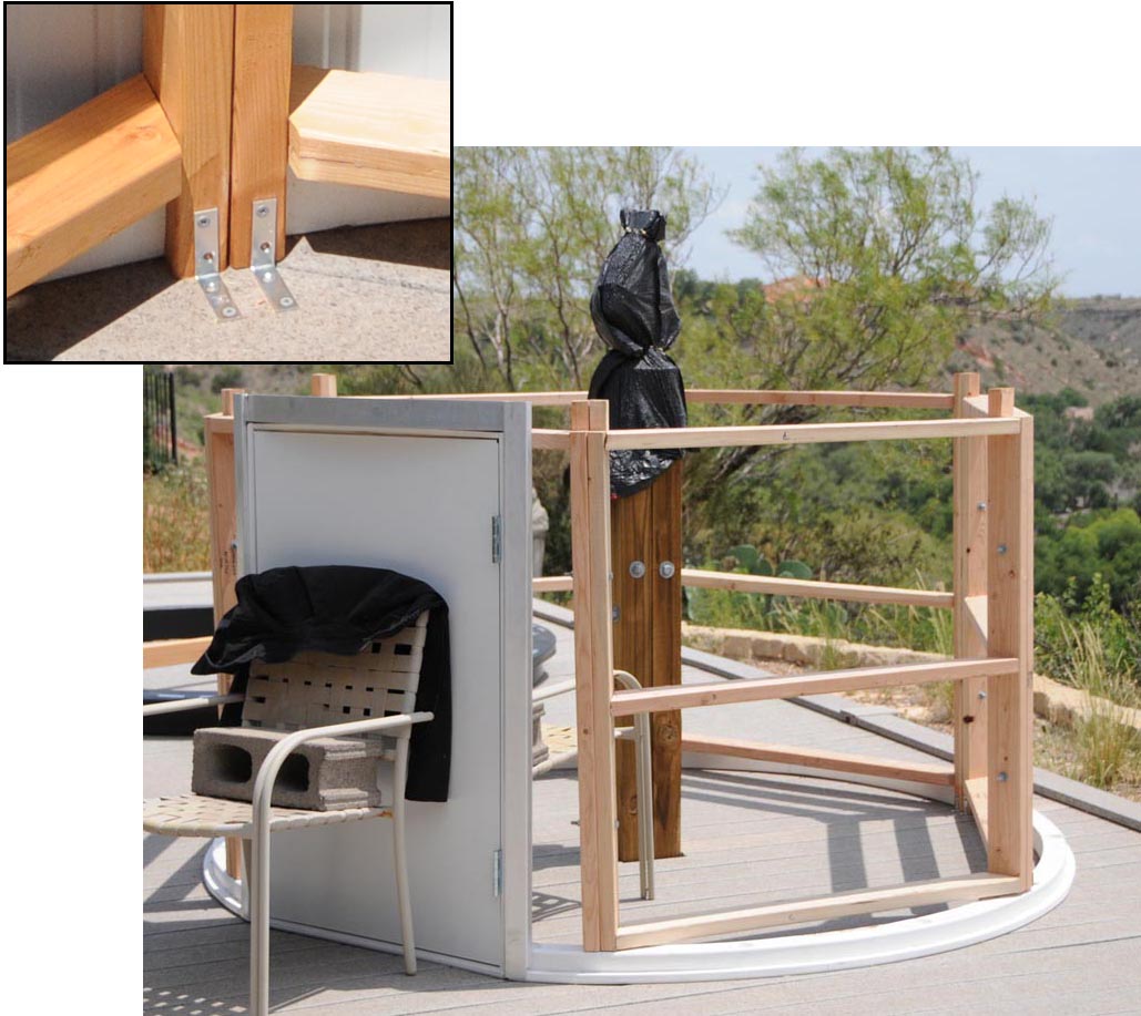 | Figure 5. The hexagonal frame built to support the weight of the observatory dome. The chairs are holding the door up, since it was not attached to the frame at this point in the construction. The inset shows that the frame was attached both to the deck and to the circular PVC base ring using long screws. |