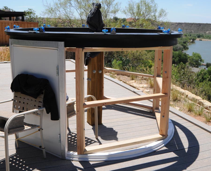 Construction of SOCO took around 3 months of off-and-on labor. Except for the two cases noted above where help was needed, the construction was performed solely by myself. The ExploraDome has turned out to be a good choice for this geographical region. It has withstood intense thunderstorms with sustained winds of 60 mph and gusts of over 80 mph. These winds were associated with driving rain and hail. In no situation has any water made it into the observatory. This is a strong testament to the excellent design of the ExploraDome and, in particular, to the design of the hatch in the dome that effectively prevents water entry when closed. The original design was modified to include the internal hexagonal frame, but this feature probably wouldn't be needed in areas with more benign weather conditions.