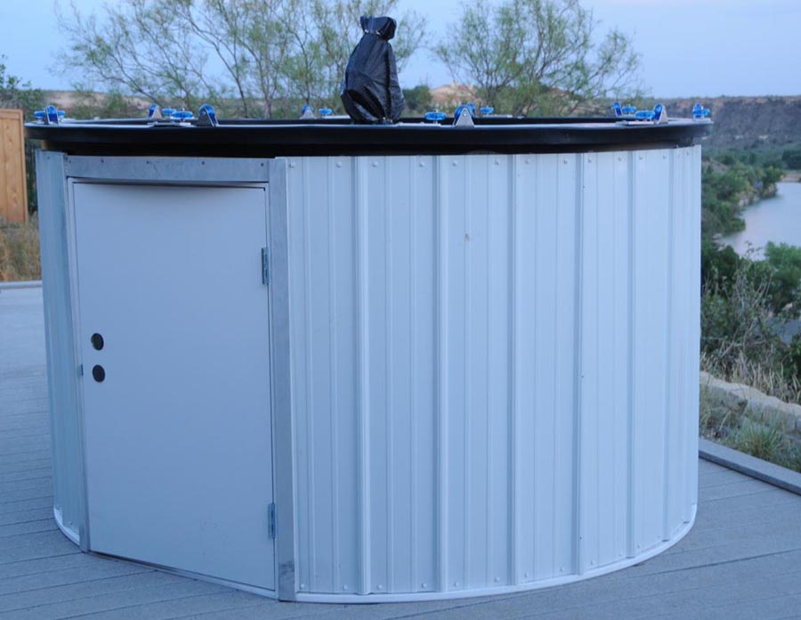 At the time of the construction of SOCO, there were a number of choices for the observatory building. Based on size and price, the candidates were narrowed down to two choices: the SkyShed POD and the PolyDome ExploraDome. Both choices are good products and each has advantages and disadvantages. Luckily, an excellent comparison of the two designs was available from Jim Weilsek and Chris Schroeder posted on the Cloudy Nights community website. Ultimately, the severe weather resistance of the two designs was the deciding factor in choosing the ExploraDome over the POD. The Texas High Plains frequently experiences severe thunderstorms, so resistance to leaking was considered to be very important.