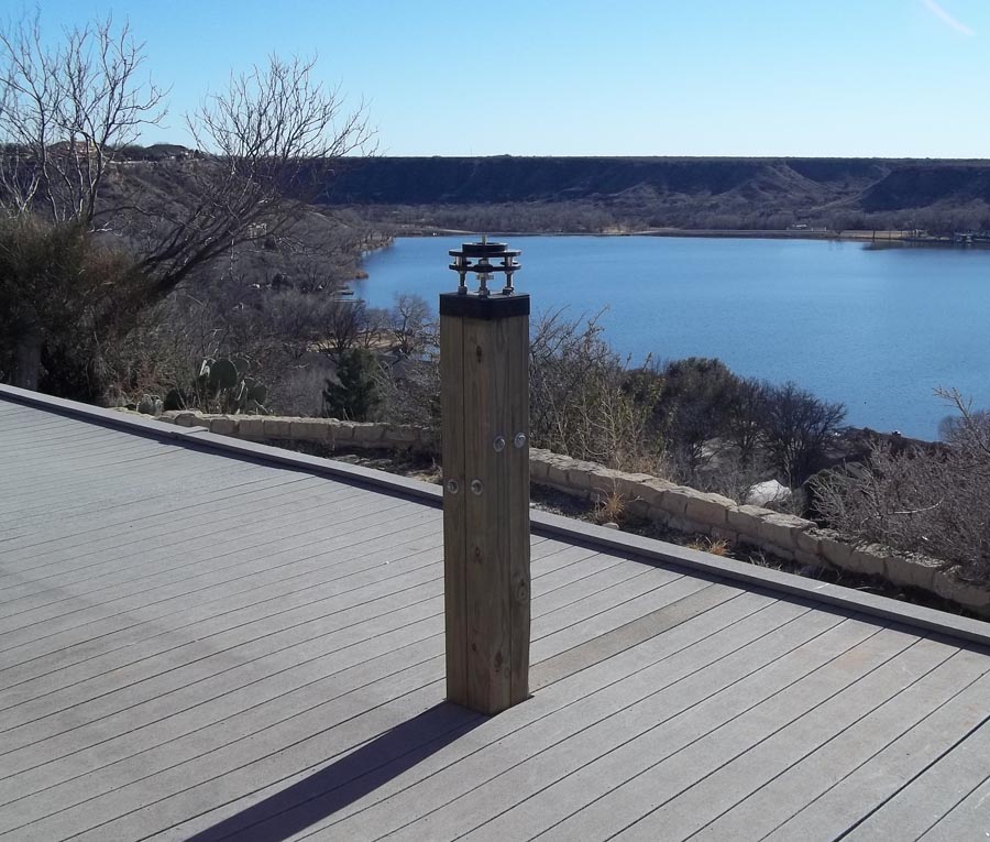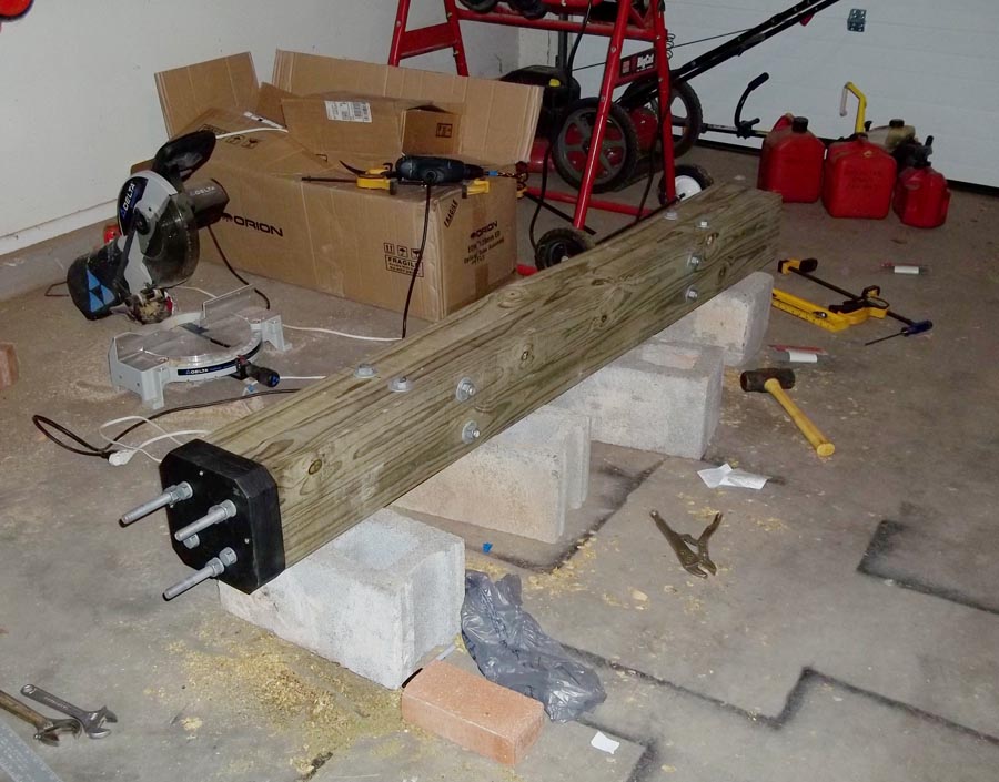 SOCO was set up on an existing deck. The first step was to set up the telescope pier. A number of good commercial piers are available. However, I had seen an example where an individual had built their own pier out of 4" X 4" pressure-treated posts. When bolted together, four created an extremely strong pier with two advantages over metal piers. First, the coefficient of thermal expansion of wood is less than metal, so a wood pier is less affected by temperature changes than a metal pier. Second, wood is better at absorbing vibration than metal, so a wood pier should transmit less vibration to the telescope as compared to a metal pier. A wooden pier was assembled from four posts held together by carriage bolts (Figure 3). The pier included a custom-fabricated adapter on top for attaching the telescope mount. The pier was easy to assemble and was relatively inexpensive.