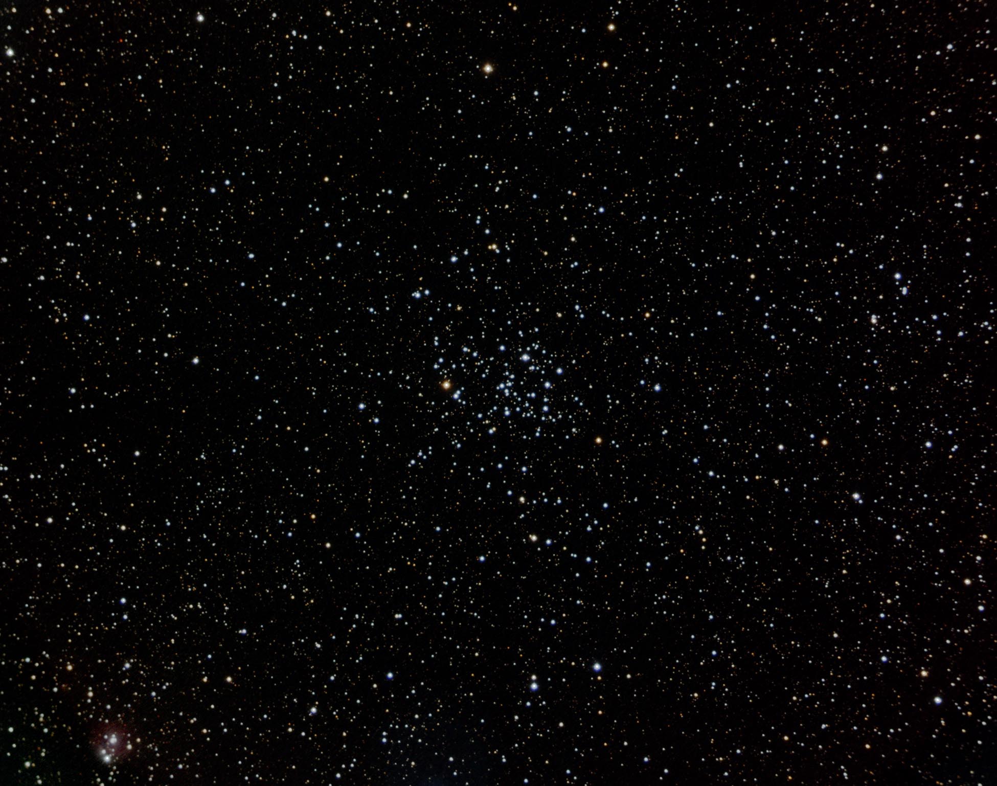 M 50 lies at a distance of around 2900 LY and has a physical diameter of around 13 LY. The cluster contains around 109 brighter members, although recent stdies suggest that it may contain as many as 2050 member stars, most of which are very faint. The brightest member (visual magnitude 7.8) is a red giant of spectral class K located just to the left of the center of the cluster in my image. Estimates of the age of M 50 range from 78 to 100 million years.