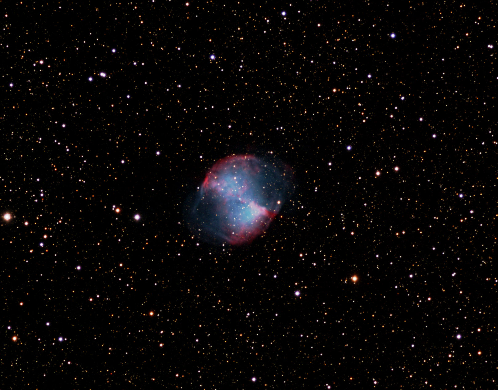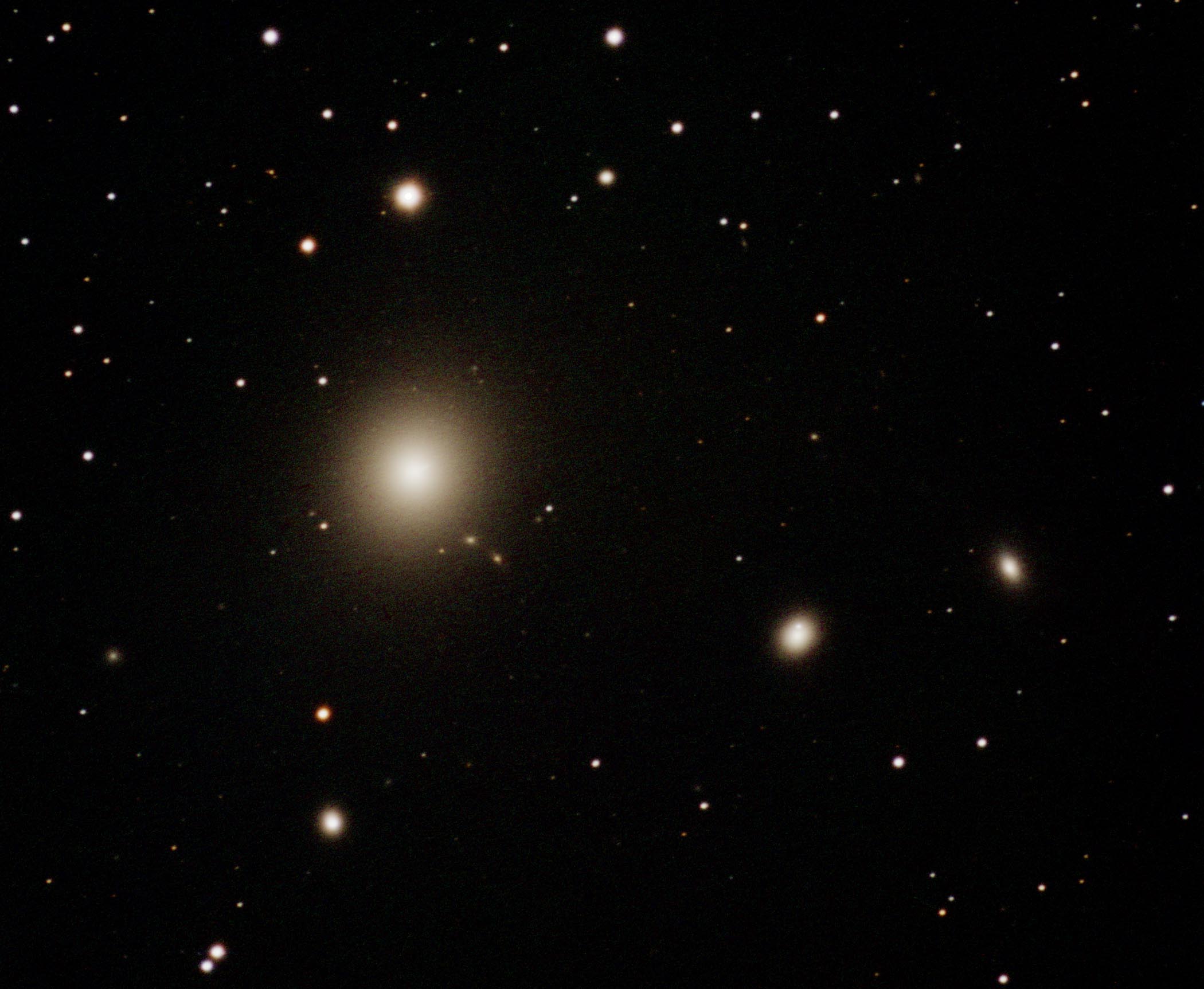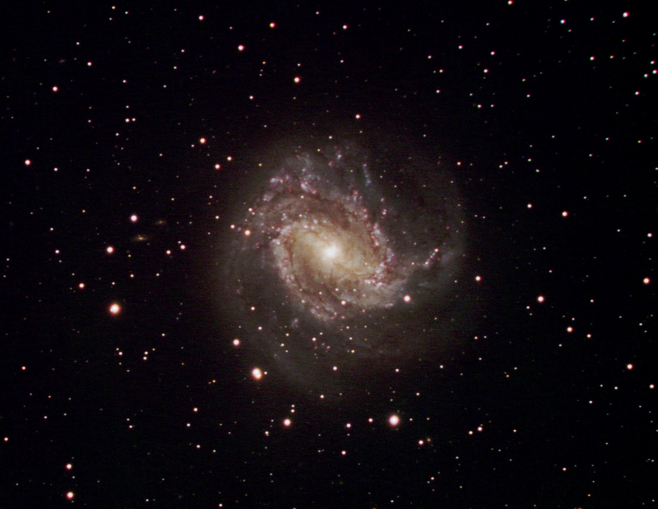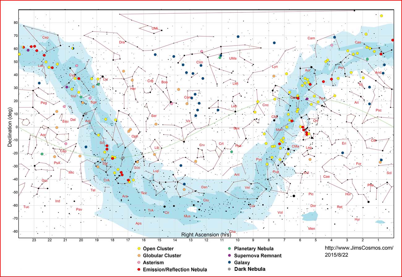 This gallery displays some of the imagery of astronomical objects acquired at SOCO. You can access the imagery in two ways. The chart below shows the distribution of imaged objects across the sky. Colored dots indicate the location and type of object (see the legend at the bottom of the chart). If you mouse-click on a dot, an image and description of the object will appear. Note that some older versions of browsers don't support this clickable chart (i.e., you can't click on a dot). If you can't click on the chart, or if you don't want to use the chart, thumbnails of all imaged objects are displayed down below the chart. Mouse-click on a thumbnail to display a full-size image and description of the object.