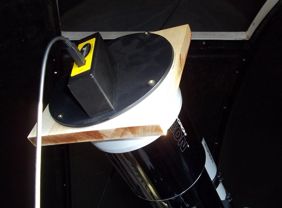 In working with the images produced by many imaging systems, one of the necessary processing steps is applying flat images (or "flat-field frames") to correct for optical artifacts in the images. The most common optical artifact is vignetting around the edges of the image. This is caused when the cone of light passing through the telescope does not uniformly illuminate the face of the CCD in the imaging camera. This could be because the cross-section of the cone of light focused onto the CCD is smaller than the dimensions of the CCD, or maybe there is a restriction in the optical path (e.g., from filters) at some point before the light reaches the CCD. In any event, the result is a marked fall-off of light along the edges (or in the corners) of the images. If this light fall-off can be quantified, then it is possible to apply a correction to the image during processing ro compensate for it. This will restore a more uniform brightness across the entire image. Flat images are specially shot images that can quantify the light fall-off. As described in the Handbook of Astronomical Image Processing (Richard Berry and James Burnell, Willmann-Bell Publishers, 2009), there are four basic ways to acquire flat images: light-box flats, dome flats, twilight flats, and sky flats. I won't go into the details of each but, in the past, I have relied on light-box flats in my image processing. Figure 1 shows my apparatus for acquiring light-box flats. It consists of an electroluminescent panel (manufactured by Alnitak Astrosystems) mounted in a home-made holder that fits over the end of the telescope. When current is applied to the electroluminescent panel, it emits a uniform level of light across its surface area. Taking an image of the illuminated panel through the telescope will show any light fall-off across the acquired image. The average of a number of individual flat images can then be used as a "Master Flat Image" to correct imagery acquired of astronomical objects, as I describe in Basic Processing Procedure I. This apparatus is easy to use and can be used at any time, day or night.