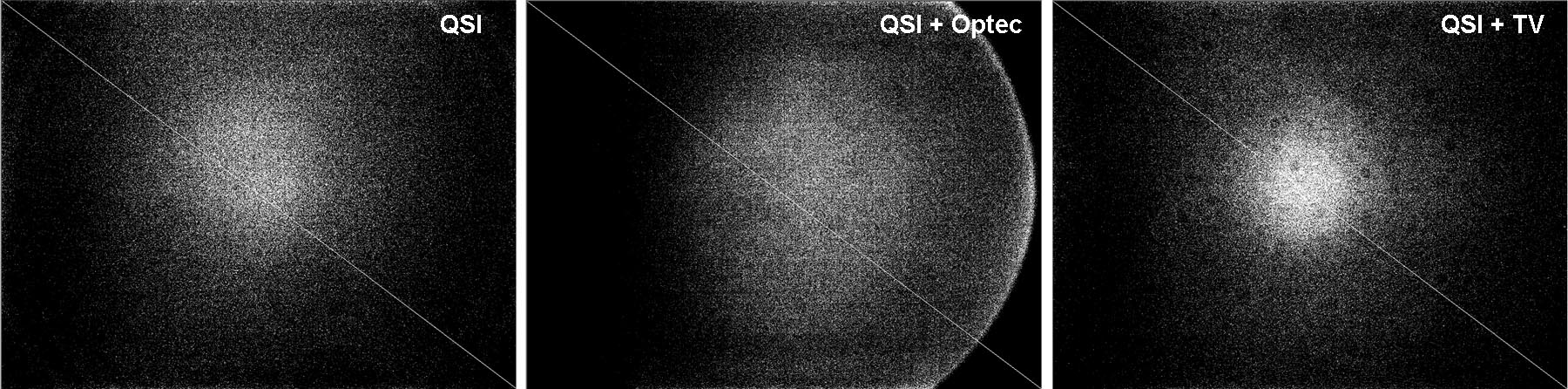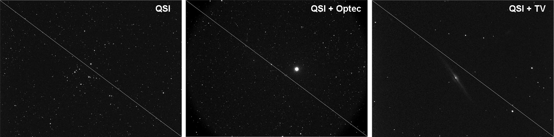 Figure 4. Raw light images acquired for (left) the QSI camera alone, (middle) the QSI camera with Optec 0.7X focal reducer, and (right) QSI camera with TeleVue 2X focal extender.