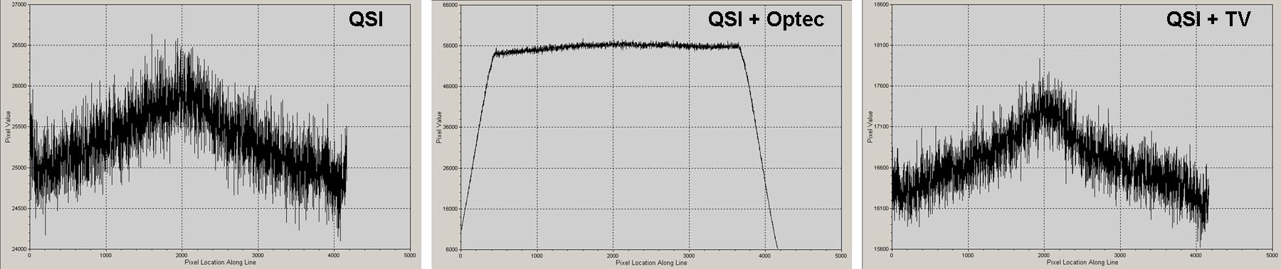 The results in Figures 2 and 3 show a central "hotspot" in the images for the QSI camera alone and the QSI camera with 2X focal extender. For both cases, the center-to-edge variation in brightness was around 1000 DCs. For the QSI camera with 0.7X focal reducer, the variation is more complex, with a central plateau in brightness rapidly falling away as the corners are approached. As the middle image in Figure 2 indicates, this plateau structure is not entirely symmetrical about the center of the image.