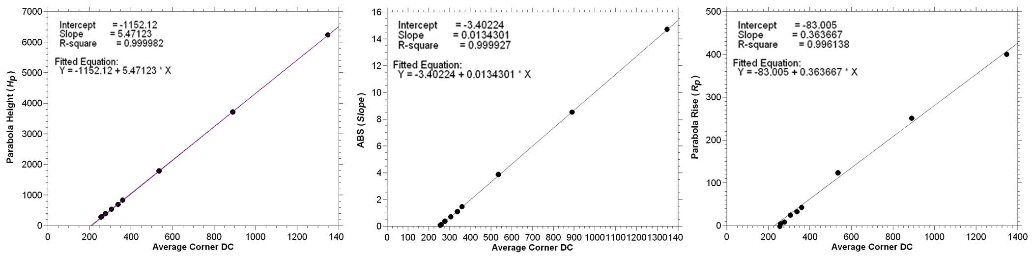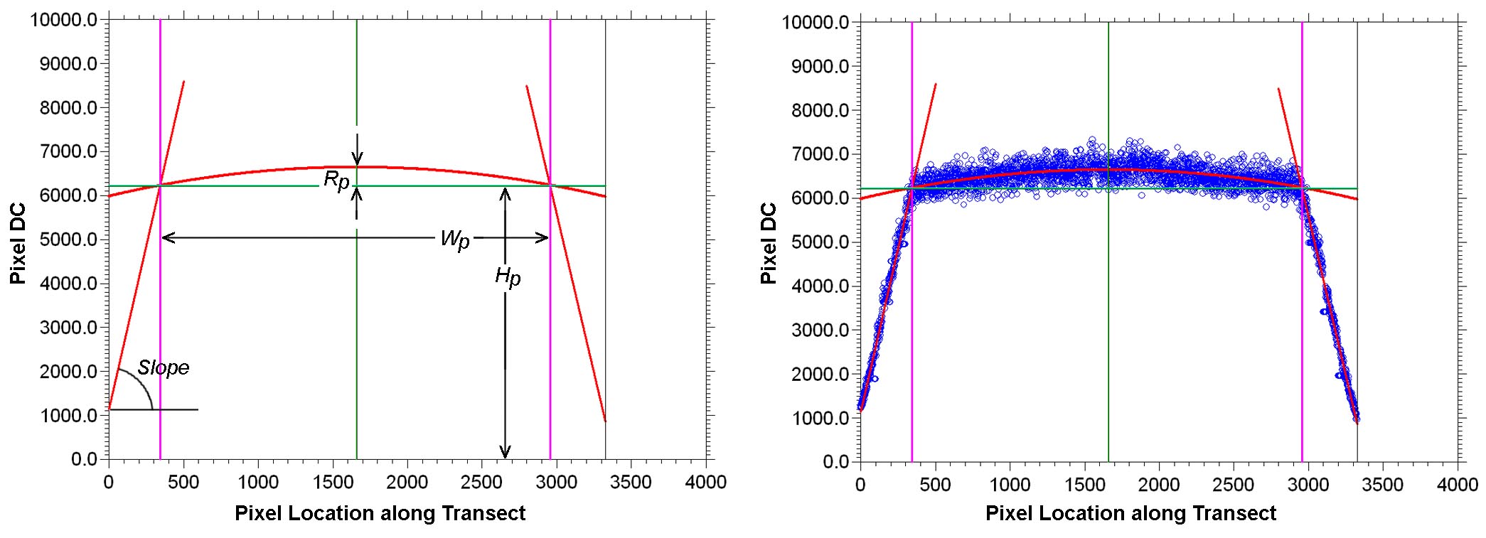 Results of regressing the parameters Hp, Rp, and Slope onto corresponding values of average image corner pixel brightness are presented in Figure 7. These results are for the Red spectral band, but results for the other spectral bands are similar. As shown in Figure 7, the relationships between the parameters and image corner pixel brightness are very strong, with R2 values extremely close to 1. This confirms that image corner brightness should be effective in estimating the parameters in the vignetting model. These results were confirmed with additional data collected on other dates.